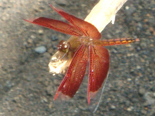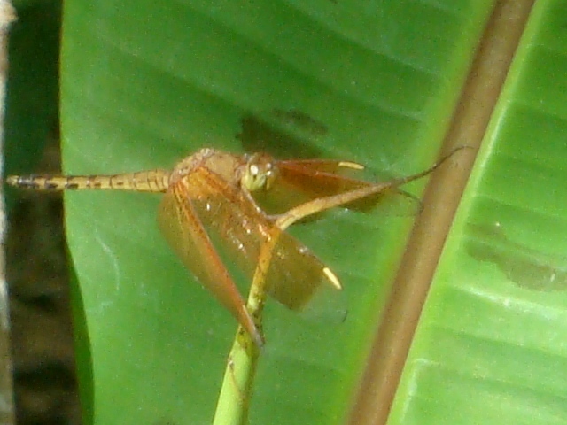 Capung yang bertengger di bagian paling atas dari bakal daun pisang ini terlihat menekuk ke bawah arah depan untuk menjaga keseimbangan tubuhnya. Bagian ujung dari sayap capung ini transparan dengan variasi coklat terang di sisi atasnya.