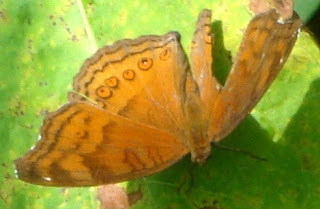 Kupu-kupu dengan warna dasar coklat dengan motof lingkaran dan bergaris-garis ini juga termasuk kupu-kupu yang membentangkan sayap ketika hinggap. Sayang, sayap kirinya robek yang tidak diketahui penyebabnya. Apa mungkin warna dan corak penyamarannya kurang efektif? Namun demikian, nampaknya kupu-kupu ini tergolong kupu-kupu yang berumur tua. Ujung sayap kanan dan sayap kirinya sudah mulai rusak. Kupu-kupu ini pun termasuk gesit dan agak penakut bila didekati manusia. Dia akan segera terbang dan berpindah ketika didekati. Kupu-kupu tersebut berhasil dipotret ketika hingga di atas daun sejenis anthurium. Dalam kesehariannya, kupu-kupu coklat termasuk serangga yang hidup menyendiri.