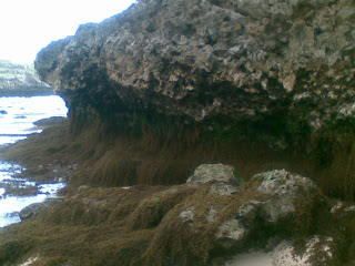 Gambar yang tersaji di atas merupakan bagian dari daerah pantai/pesisir Ngliyep, Kecamatan Donomulyo Kabupaten Malang. Bagian perairan laut dangkal di sekitar ceruk banyak ditumbuhi ganggang/rumput laut. Ganggang/rumput laut tropis yang memang hanyak hidup di sekitar daerah tersebut. Ketika air laut mengalami pasang surut seperti yang nampak pada gambar, ganggang/rumput laut tersebut yang teronggok di sekitar ceruk. Sayang, potensi sumberdaya alam ini belum dikelola dengan baik oleh masyarakat sekitar. Memang ada sekelompok kecil dari mereka yang telah memanfaatkannya. Mereka pun hanya sekedar mengambil tersedia di alam, lingkungan mereka. Padahal menurut penuturan seseorang yang pernah berprofesi sebagai pengumpul ganggang/rumput laut, bahwa tumbuhan laut itu belum tentu setiap saat ada. Pada saat tertentu, tumbuhan tersebut tidak nampak dan pada saat yang lain, di bulan-bulan berikutnya nampak hidup subur di perairan dangkal di sekitar ceruk klif. Belum ada di antara pengumpul ganggang/rumput laut tersebut yang berusaha membudidayakan, walau di berbagai tempat lain di Indonesia usaha tersebut sudah banyak dilakukan.
