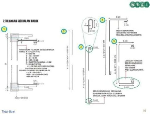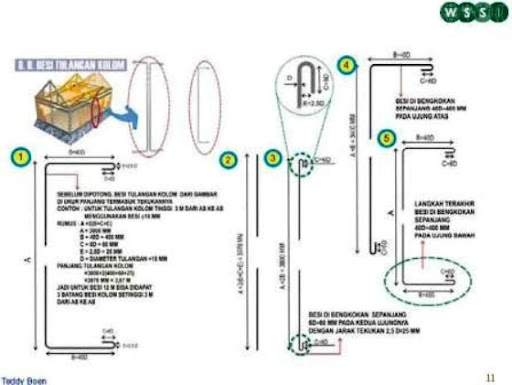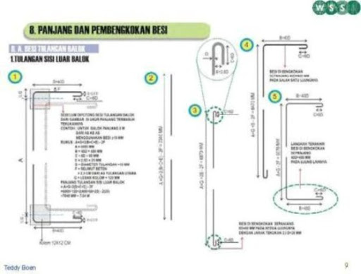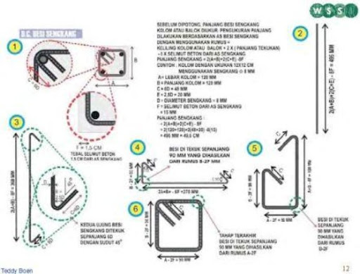 2. Panjang besi standar di pasaran adalah 12 meter (lihat syarat SNI tentang baja tulangan beton). Maka pertimbangkanlah sisa-sisa hasil potongan, untuk kemudian di agar dapat digunakan untuk membuat penulangan yang lainya. Secara teknis penyambungan baja tulangan beton dibolehkan, hanya saja cara penyambungan, jumlah sambungan maksimal tiap bentang dan letak sambungan diatur agar sesuai dengan kaidah teknis. Detail sambungan dan detail pertemuan masing-masing penulangan akan dibahas ditemat yang lain.