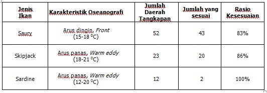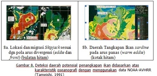 Contoh dari pemanfaatan fenomena suhu laut dan gejala-gejala alam seperti upwelling, eddie dan front untuk memonitor daerah penangkapan ikan jenis-jenis tertentu seperti skipjack, saury dan sardine dapat dilihat pada Tabel 1 dan Gambar 8 di bawah ini.