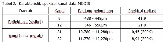 Data SPL diekstraksi dari kanal emissive (infra merah) 31 (10,780μm) dan kanal 32 (11,770-12,270μm), data konsentrasi klorofil diekstraksi dari kanal visible (reflektansi) 8 (405-420μm), kanal 9 (438-448μm), dan kanal 12 (546-556μm). Bahan-bahan yang digunakan dalam penelitian adalah data MODIS rekaman bulan Januari – Desember 2006. Spektral kanal yang dibutuhkan dapat dilihat pada Tabel 2.