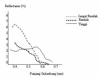 Energi elektromagnetik yang dipantulkan, diserap, dialirkan maupun di pancarkan ini sifatnya sangat bervariasi tergantung pada karakteristik obyek-obyek di permukaan bumi tersebut. Keadaan ini menunjukan bahwa setiap obyek dibumi mempunyai spectral respond (reaksi spektral) yang berbeda. Hal inilah yang dimanfaatkan dalam sistim inderaja melalui sistim sensor pada satelit yang juga mempunyai spectral sensitivity (kepekaan terhadap spektral) tertentu sebagai dasar terbentuknya data inderaja. Adapun karakteristik spektral dari beberapa unsur-unsur utama di permukaan bumi, yaitu tumbuhan, tanah dan air dapat dilihat pada Gambar 3.
