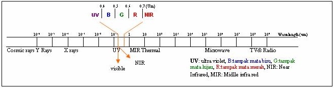 Dengan mengacu pada fenomena alam yang menunjukan adanya karakteristik obyek di bumi yang sangat spesifik dalam merespond energi matahari (yang berada pada spektrum elektromagnetik), yang antara lain ditunjukan pada gambar 3. Dapat dilihat peranan spektrum tampak mata (visible spectrum) untuk sumberdaya kelautan, yang ditunjukan oleh kurva reflectancenya pada tubuh air. Spektrum ini mempunyai panjang gelombang berkisar antara 0.4-0.7 um, yang terdiri dari spektrum tampak mata biru (visible blue) dengan panjang gelombang 0.4–0.5 um, spektrum tampak mata hijau (visible green) dengan panjang gelombang 0.5–0.6 um dan spektrum tampak mata merah (visible red) dengan panjang gelombang 0.6–0.7 um (Jensen, 1986; Lillesand and Kiefer, 1987; Swain and Davis, 1978).
