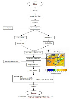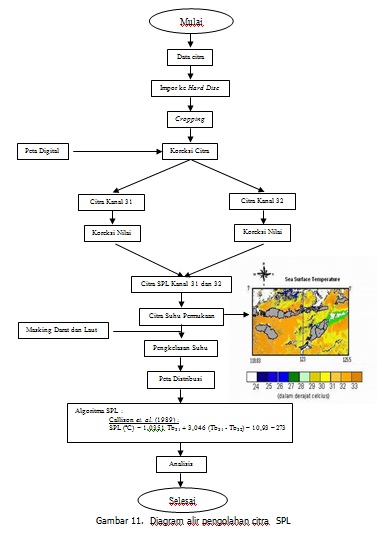 Dengan SPL (ºC) adalah suhu permukaan laut (ºC), Tb31 dan Tb32 masing-masing adalah suhu kecerahan dari kanal 31 dan 32 MODIS. Proses pengolahan data SPL ini dilakukan dengan menggunakan perangkat lunak ER Mapper.
