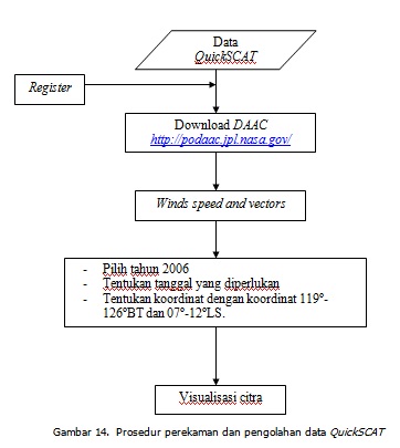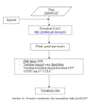Citra angin QuickSCAT menggambarkan pola angin secara umum dengan arah dan kecepatan angin (m/s) yang dapat menjadi data pendukung untuk mengetahui kondisi fisik dari wilayah perairan penelitian. Diagram alir untuk data QuickSCAT dapat dilihat pada Gambar 14.
