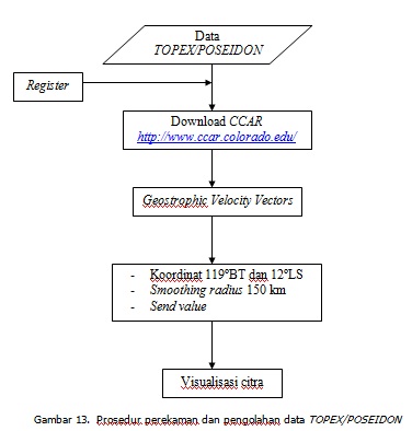 Citra TOPEX yang digunakan adalah citra TOPEX/POSEIDON COLORADO yang menggambarkan pola arus secara lokal dan juga dapat menggambarkan kejadian terbentuknya eddies. Diagram alir TOPEX/POSEIDON dapat dilihat pada Gambar 13.