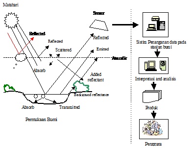 Dalam perjalanannya, sebagian dari energi ini akan dipantulkan oleh partikel debu maupun molekul air ataupun mengalami refraksi (scattered radiation) pada lapisan atmosfir. Sementara sebagian dapat berinteraksi dengan bumi dan dapat dipantulkan (reflected energy), diserap (absorbed energy), ataupun dialirkan ke lapisan lain (transmitted energy). Data yang dipantulkan obyek di bumi (disebut sebagai nilai reflectance) ini yang direkam oleh sensor pada satelit, dikirim ke stasiun bumi dan diterjemahkan sebagai nilai kecerahan (brightness value) atau nilai digital (digital value) saat disimpan pada computer compatible tape (CCT) untuk pemanfaatan lebih lanjut (lihat Gambar 2).